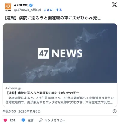 夫「具合が悪い…」妻「病院連れてくよ!」→夫、妻の運転する車に轢かれて死亡 北海道