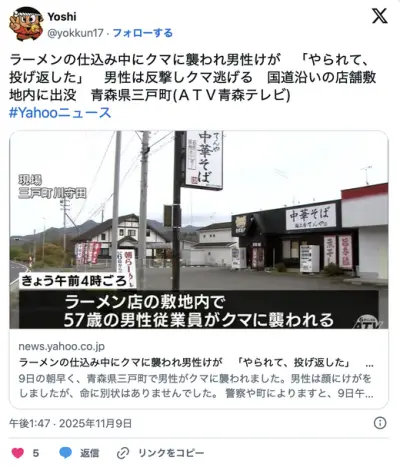 【青森】ラーメンの仕込み中にクマに襲われ男性けが「やられて、投げ返した」クマが逃げたので仕込み作業を続ける