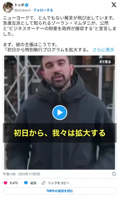 NY新市長ゾーラン・マムダニ氏「ビジネスオーナーの財産を政府が接収する!」