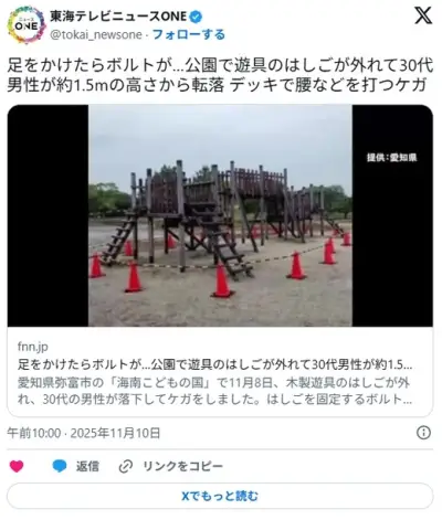 【愛知】足をかけたらボルトが…公園で遊具のはしごが外れて30代男性が約1.5mの高さから転落 デッキで腰を打つケガ 海南こどもの国