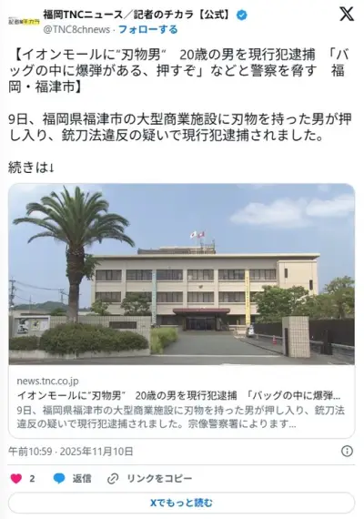 【福岡】イオンモールに“刃物男” 20歳の男を現行犯逮捕 「バッグの中に爆弾がある、押すぞ」などと警察を脅す 福津市