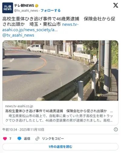 【埼玉】「保険会社から警察に行った方がいいと言われた」自転車の男子高校生をひき逃げか 46歳男逮捕