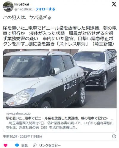 【埼玉】尿を…電車で棚にビニール袋を置いた派遣社員の男逮捕、職員が対応せざるを得ず業務妨害の疑い 警官、目撃し緊急停止ボタン押す