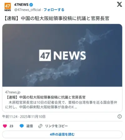 【速報】中国の駐大阪総領事投稿に抗議と官房長官