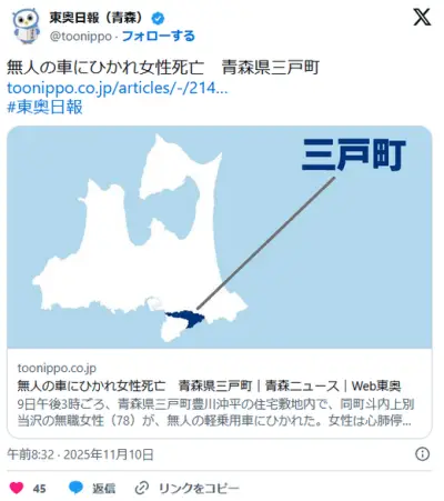 【青森】無人の車にひかれ…78歳女性死亡 三戸町