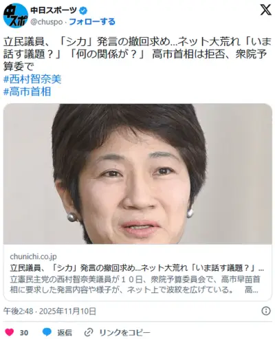 立憲・西村議員のシカ発言撤回要求にネット大荒れ「いま話す議題?」「何の関係が?」 「立憲はゴミ」