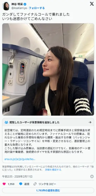 元ミス東大でタレントの神谷明采、いつも“ファイナルコール”で飛行機に搭乗? 「ほんっとに迷惑」「二度と乗らないで」と炎上