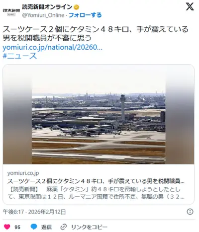 スーツケース2個にケタミン48キロ、手が震えている男を東京税関職員が不審に思う