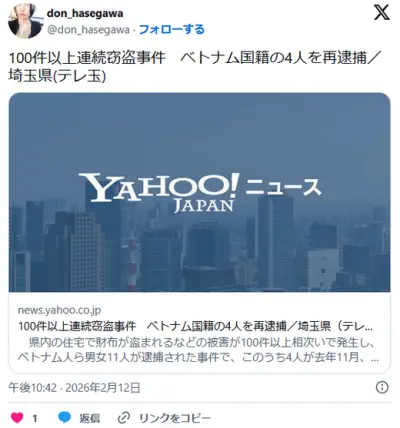 【埼玉】グエン・ゴック・ヴィエット容疑者ら4人を再逮捕 100件以上連続窃盗事件