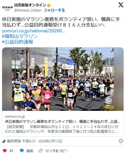 休日実施のマラソン業務をボランティア扱い…公益目的通報受け816人分支払いへ-福知山市