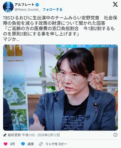 【速報】チームみらい安野「老人の医療費負担は、全て3割とする!」