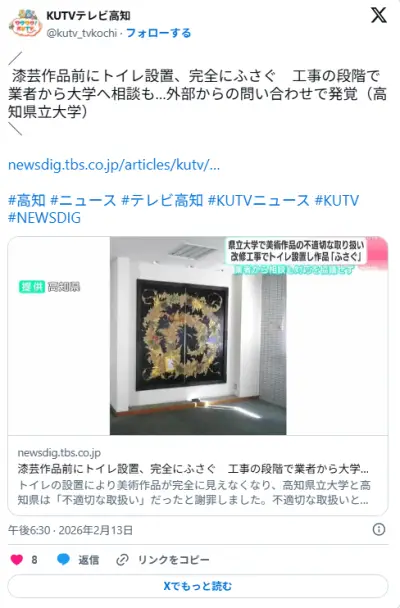 業者「あの、ここにトイレ設置するんですか?美術品完全に隠れますけど」 高知県立大「問題ない、やれ」