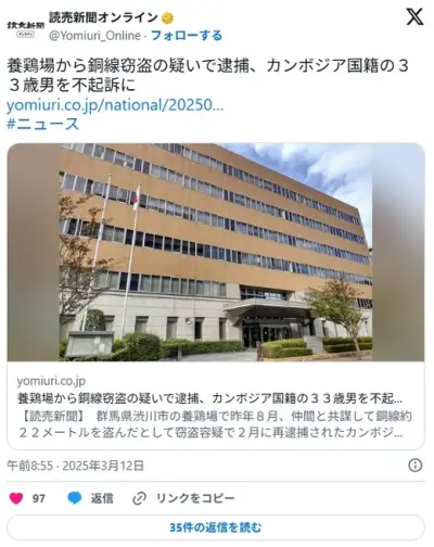 養鶏場から銅線窃盗→空調止まり5万3000羽死ぬ…疑いで逮捕、カンボジア国籍の33歳男を不起訴に