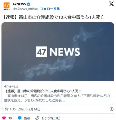 【速報】富山市の介護施設で10人食中毒うち1人死亡