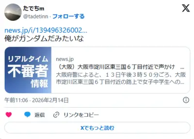 (ヽ´ん`)「不審者がいるから気を付けて、俺が不審者や」 女子中学生に声がけ 小柄で灰色スウェットの男