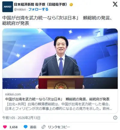 中国が台湾を武力統一なら「次は日本」 台湾・頼総統の発言、総統府が発表