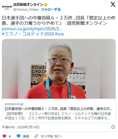 【五輪】“日本選手団への中傷投稿” 6・2万件…団長「想定以上の件数、選手の力奪うからやめて」(読売新聞)