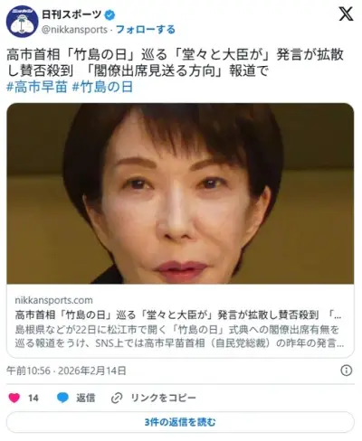高市首相「竹島の日」巡る「堂々と大臣が」発言が拡散し賛否殺到 「閣僚出席見送る方向」報道で