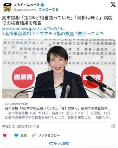 高市首相「指2本が相当曲っていた」「骨折は無く」病院での検査結果を報告