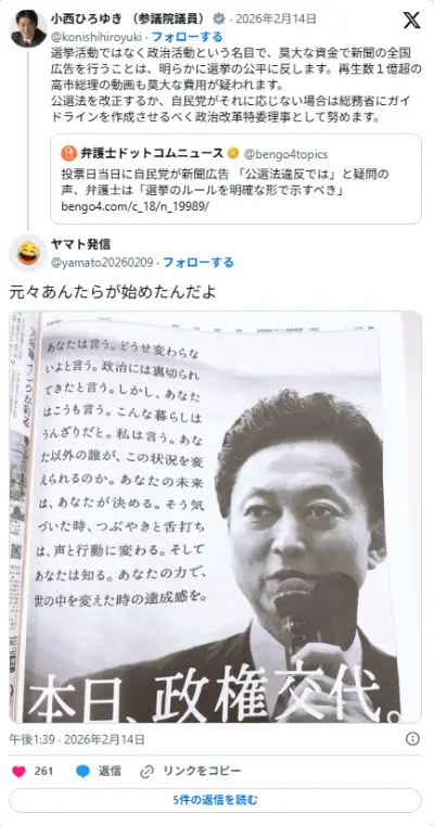 立民・小西「政治活動名目で新聞の全国広告を行うのは選挙の公平に反する」 X民「じゃあこれは?」