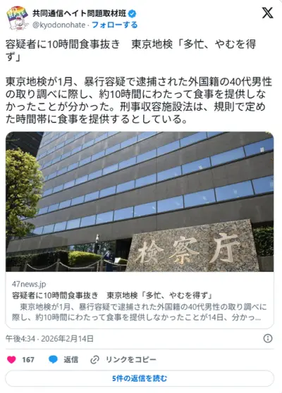 共同通信「東京地検が外国籍容疑者に10時間食事提供せず!!」 ← だから何?これがニュース?