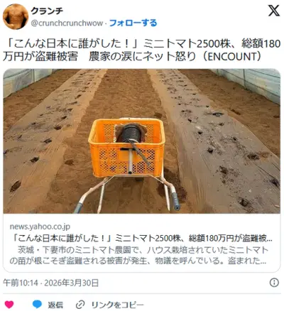 「こんな日本に誰がした!」ミニトマト2500株、総額180万円が盗難被害 農家の涙にネット怒り