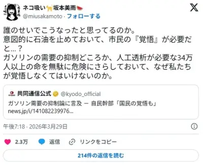 坂本美雨、石油不足めぐる政治家の発言に憤り「誰のせいでこうなったと思ってるのか」「意図的に石油を止めておいて『覚悟』が必要?」