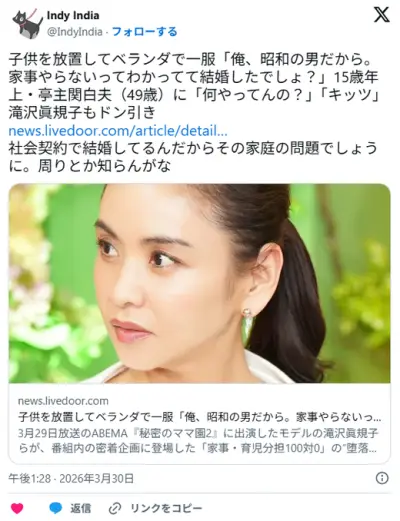 【ABEMA】「俺、昭和の男だから。家事やらないってわかってて結婚したでしょ?」49歳亭主関白夫にモデルの滝沢眞規子もドン引き