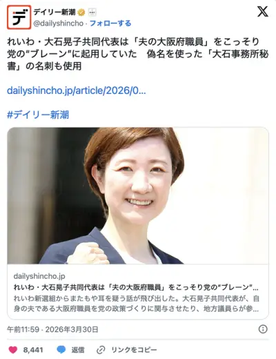 れいわ大石代表「夫の大阪府職員」をこっそり党のブレーンに起用していた。偽名で秘書の名刺も使用