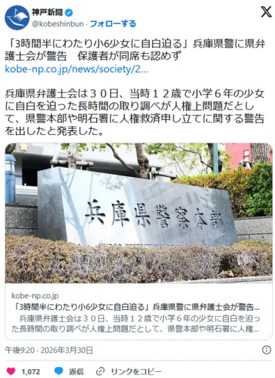 【兵庫県警】「3時間半にわたり小6少女に自白迫る」兵庫県警に県弁護士会が警告 保護者が同席も認めず 明石署