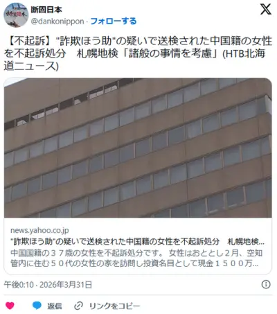 【不起訴】"1500万詐欺ほう助"の疑いで送検された中国籍の女性を不起訴処分 札幌地検「諸般の事情を考慮」