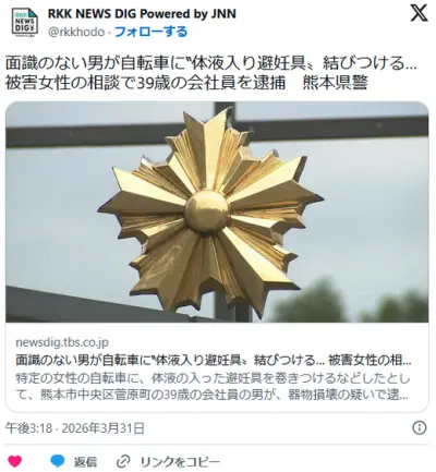 自転車に‶体液入り避妊具〟結びつける… 被害女性の相談で39歳の会社員を逮捕