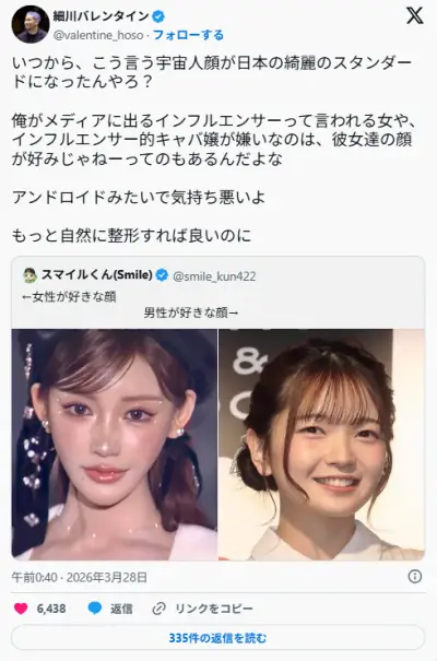 細川バレンタイン氏「インフルエンサーやキャバ嬢が嫌い」「アンドロイドみたいで気持ち悪いよ。もっと自然に整形すれば良いのに」