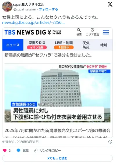 【チリン╰⋃╯チリン】男性職員の下腹部に鈴とひもを付け懇親会の参加者に拝むなど促す 新潟県の50代女性課長