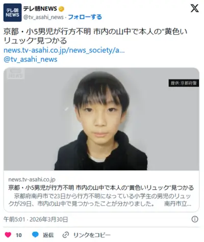 【京都】小5男児の行方不明から8日 消防団“捜索当初リュックなかった” 2、3回行って発見できず、29日に親族が発見