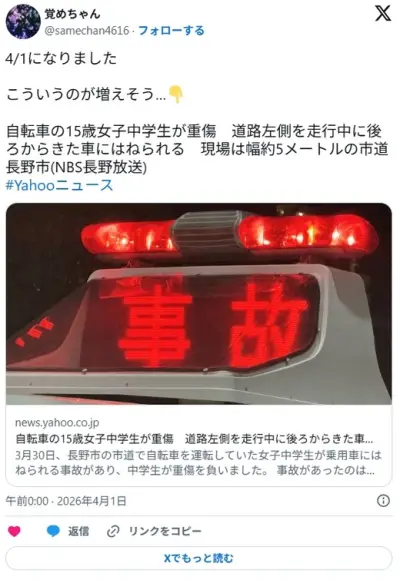 自転車の15歳女子中学生が重傷 道路左側を走行中に後ろからきた車にはねられる