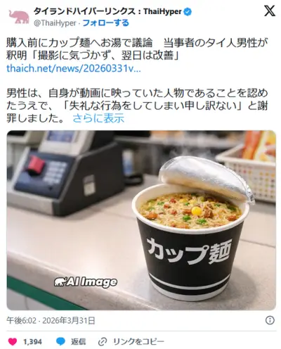 購入前にカップ麺へお湯で議論 当事者のタイ人男性が釈明「撮影に気づかず、翌日は改善」⋯日本のコンビニで