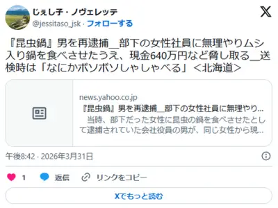 45歳男、部下の女性に罰ゲームで「昆虫鍋」を食わせたうえに現金640万円を脅し取った容疑で逮捕