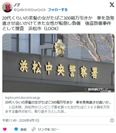 【静岡】20代くらいの茶髪の女がたばこ300箱万引きか 車を急発進させ追いかけてきた女性が転倒し負傷 強盗致傷事件として捜査 浜松市