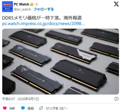 メモリ価格が暴落、DDR5しか作れない米国製が20%、中国製が30%の値下り。日本製のHBMは値上り