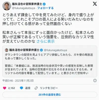 弁護士「ダウンタウンプラス、課金したけど全然面白くない。身内で盛り上がってるだけ」