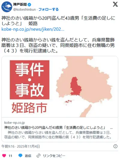 神社のさい銭箱から20円盗んだ43歳男「生活費の足しにしようと」