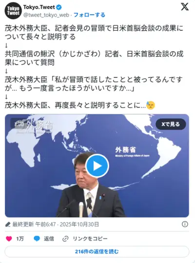 茂木外相「共同通信さん、その質問私が冒頭に話した内容とほぼ同じですよね…?」