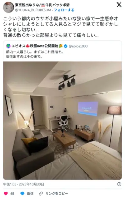 【大炎上🔥】X女「東京の狭い部屋で無理してお洒落、痛すぎる」→都民の逆鱗に触れてしまう