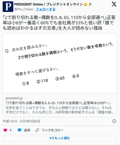 【本】「2で割り切れる数=偶数を0、8、65、110から全部選べ」正答率は小6が一番高く60%でも会社員が33%と低い訳