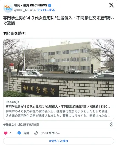 【福岡】「お姉さんお姉さん。性行為しませんか」 男(26)が40代女性宅に“住居侵入・不同意性交未遂” 疑いで逮捕 同室には子供が就寝