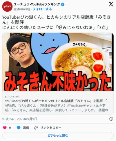 YouTuberびわ湖くんがヒカキンのリアル店舗版「みそきん」を酷評「まずいがな。カップラーメンのみそきんのほうがうまいわ」