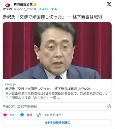 【日米関税】赤沢担当相「一貫して最後まで米国を押し切った」