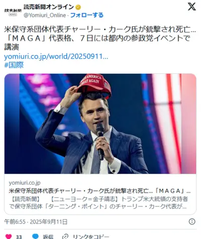 チャーリー・カーク氏が銃撃され死亡…トランプ氏支持の米保守系団体代表 7日には参政党イベントで講演「トランプ政権誕生の立役者」