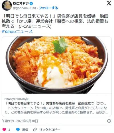 「あいつ日本人じゃない」「明日でも毎日来てやる!」男性客が店員を威嚇 動画拡散で「かつ庵」運営会社、警察への相談や法的措置も
